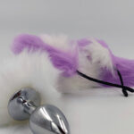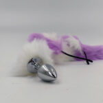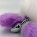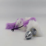 סט באט פלאג קטן ממתכת עם זנב פרווה מלאכותית בצבעי סגול ולבן וקשת אוזניים מפרווה בצבע סגול ולבן וממתכת שחורה.מתאים לפט פליי קוספליי ועוד הרבה משחקי תפקידים קינקים אחרים.