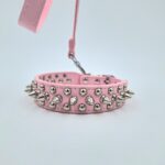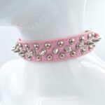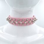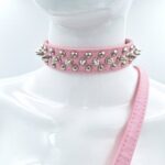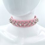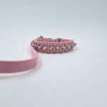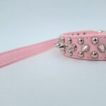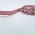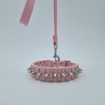 סט קולר דמוי עור ורוד עם ניטים לעיטור בצבע כסף עם רצועה מדמוי עור ורוד משולב בבד ניילון.