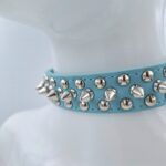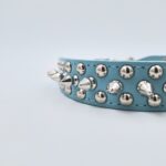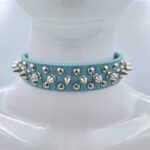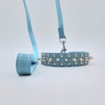 סט קולר דמוי עור תכלת עם ניטים לעיטור בצבע כסף עם רצועה מדמוי עור בצבע תכלת משולב בבד ניילון.