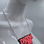 שרשרת מתכת בצבע כסף, עם תליון אקרילי זוהר באולטרה בצבע ורוד עם רקע שחור DADDYS GIRL