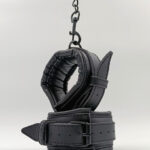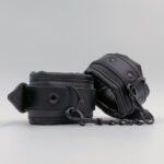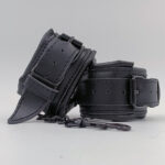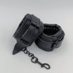 אזיקי רגליים עשויים דמוי עור שחור ושרשראות מתכת בצבע שחור מט מעולים למשחקי שליטה והגבלת תנועה .